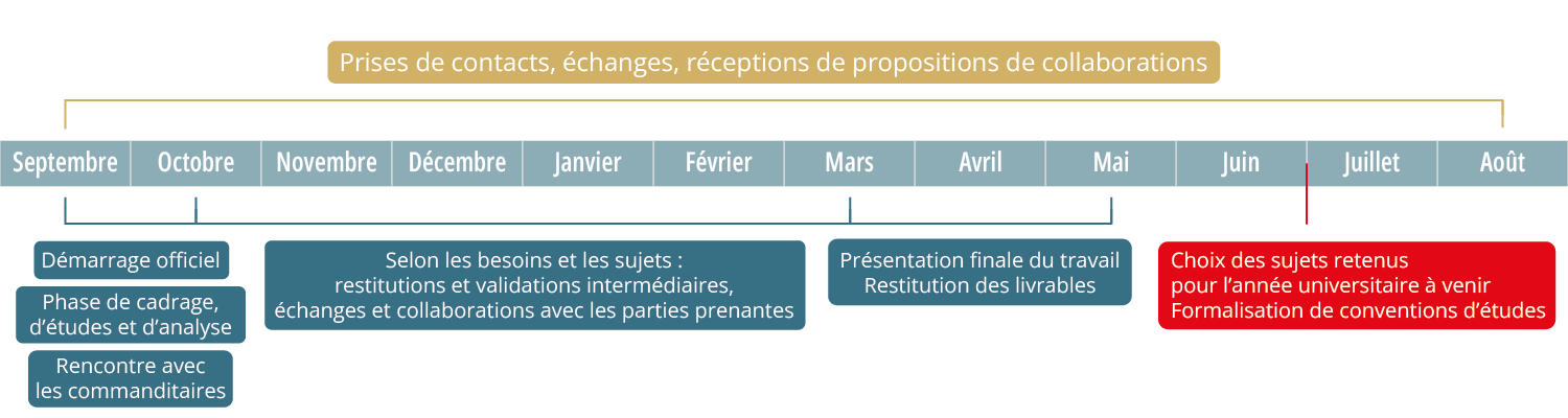 Les ateliers se déroulent pendant l’année universitaire, soit sur un semestre, soit sur l’ensemble de l’année. Ils servent de fil rouge, permettant de faire le lien avec les autres cours suivis tout au long de l’année.